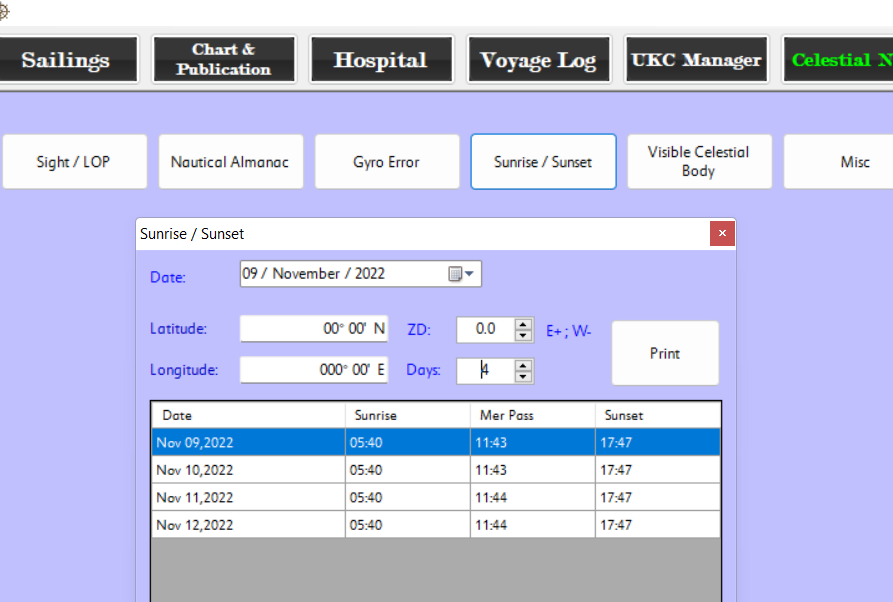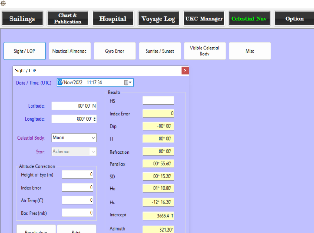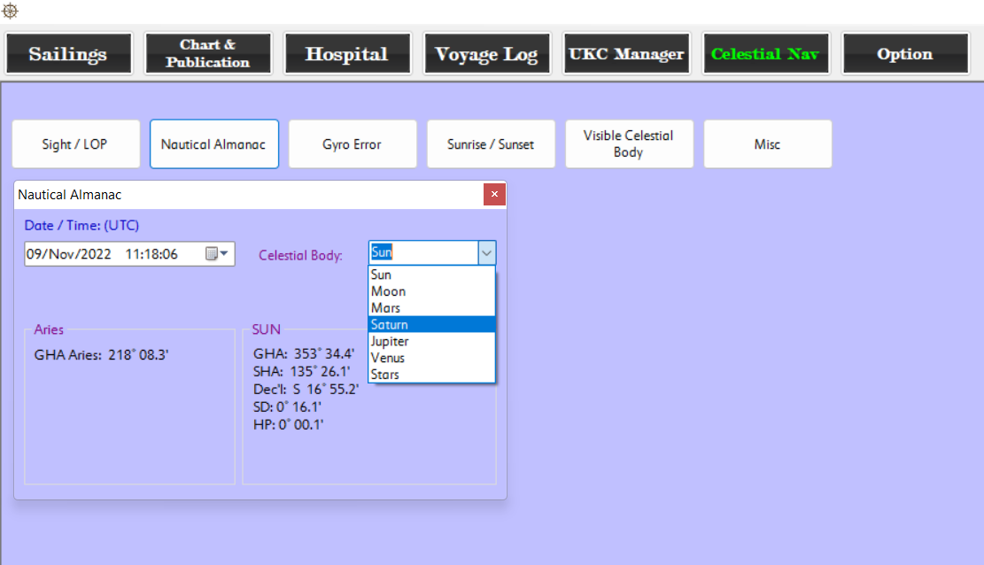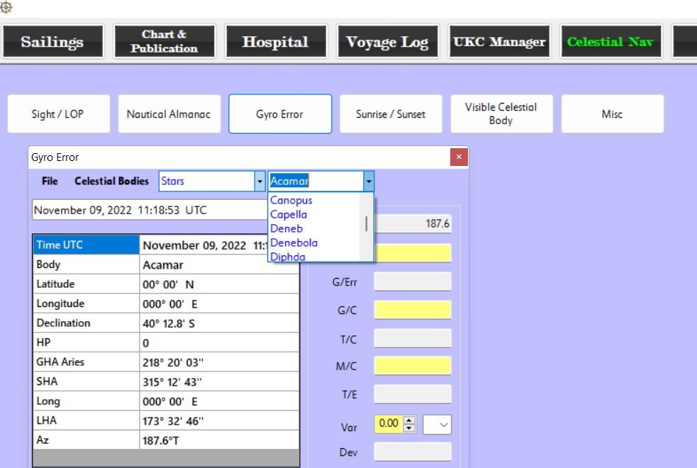 *FeaturesNautical AlmanacGyro ErrorLOPSunrise / Sunset--more--